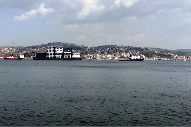 İstanbul Boğazı'ndan 8 katlı apartmanı andıran blok platformu taşıyan Panama bayraklı Christos XXIV adlı römorkör geçti.