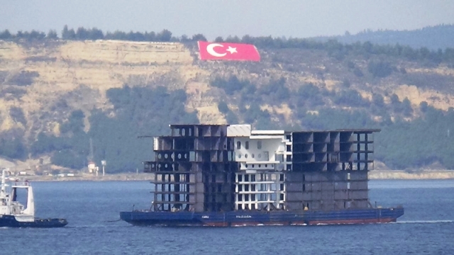 Geminin taşıdığı 8 katlı apartmanı andıran bloklu malzemenin boğazdan geçişine Kıyı Emniyeti Genel Müdürlüğü botları eşlik etti.
