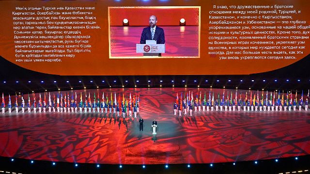 Kazakistan’ın başşehri Astana’da 89 ülkeden 2 binden fazla sporcunun katıldığı 5. Dünya Göçebe Oyunları görkemli törenle açıldı. Dünya Etnospor Konfederasyonu Başkanı Bilal Erdoğan konuşma yaptı.