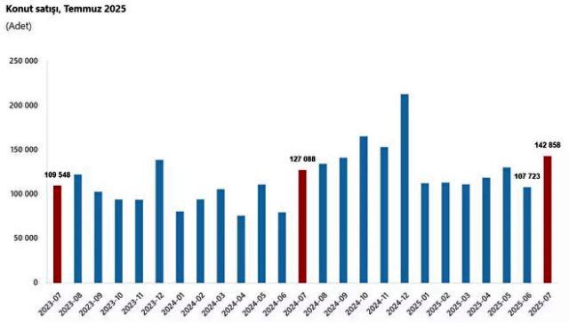 Buna göre; Türkiye genelinde konut satışları temmuz ayında bir önceki yılın aynı ayına göre yüzde 12,4 artarak 142 bin 858 oldu.