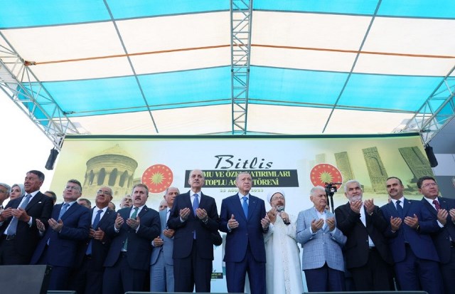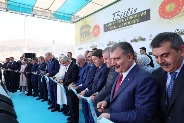 Bitlis Eren Tekstil Fabrikası önünde gerçekleştirilen, kamu ve özel yatırımlar toplu açılış törenine katılarak bir konuşma yapan Cumhurbaşkanı Recep Tayyip Erdoğan, Malazgirt Zaferi’nin 952’nci yıl dönümünü kutlamak için bugün Bitlis’te olduklarını, yarın da Muş’u ziyaret edeceklerini söyledi. Bugünkü törenle güncel rakamlarla toplam tutarı 12,5 milyar lirayı bulan kamu ve özel sektör yatırımlarını resmen hizmete açtıklarını ifade eden Cumhurbaşkanı Erdoğan, “Bu yatırımlar arasında il özel idaremizden belediyelerimize, millî eğitimden müftülüğe, vakıflardan emniyete, kara yollarından devlet su işlerine kadar tüm kurumlarımızın hizmet ve projeleri bulunuyor. Böylece kamu yatırımı olarak 75 kalem eser ve hizmeti bugün resmen Bitlis’imizin istifadesine sunmuş oluyoruz. Ayrıca Bitlis Organize Sanayi Bölgesi’nde 3 bin kardeşimize istihdam oluşturan 34 firmamızın resmî açılışını yapıyoruz” dedi.