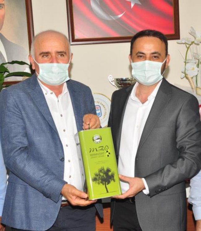 Manavgat Ziraat Odası Yönetimi gerçekleştirdiği ziyaretlerde Manavgat Ziraat Odası Zeytin Yağı Fabrikasında Manavgat’ın zeytinlerinden üretilen kendi markası zeytinyağını hediye etti.