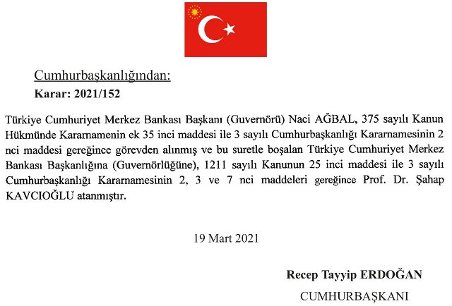 Türkiye Cumhuriyet Merkez Bankası Başkanı Naci Ağbal görevden alındı. Yerine AKP eski milletvekili Prof. Dr. Şahap Kavcıoğlu getirildi. Bu atamayla Cumhuriyet tarihinde ilk kez, Merkez Bankası'na 20 ay içinde dördüncü başkan atanmış oldu.