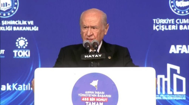 MHP Genel Başkanı Devlet Bahçeli, Cumhurbaşkanı Recep Tayyip Erdoğan’ında bulunduğu Hatay’ın Antakya ilçesinde 455 bininci afet konutu teslim törenine katıldı. Burada, Cumhurbaşkanı Recep Tayyip Erdoğan’dan önce, Atatürk Caddesi üzerinde toplanan kalabalığa seslenen Bahçeli, "Türk milleti tarihin hiçbir döneminde felaketlere boyun eğmemiş sabrın, şükrün ve metanetin istikametinden ayrılmamıştır. Bereketin yağacağına inanarak nice zorluğa göğüs germiş karamsarlığın yüksek dalga boyutunu her seferinde imanla iradeyle açmasını bilmiştir. Pek çok fitne odaklarına ve karanlık kampanyaya rağmen devlet ile millet arasına hiçbir menfur ve melun iç ve dış ihraç girememiştir. Felaketleri geçim kapısı haline getirmek için el ovuşturanlar sonuçta ve sonunda mutlaka kaybetmiştir. Acılarımızın ve anılarımızın üzerinde istismar şantiyesi kurmak için devreye girenler en derin hayal kırıklığına uğramışlardır. Yapmak yerine yıkmanın, doğru ve dürüst olmak yerine yalan söyleminin peşine düşenler milletin safında değil, zilletin yanında olduranı asla gizleyememişledir. Felaketlerden rant devşirmenin arayışına girmek ahlaki ve şükranı bir tavır olmadığı gibi demokrasi ve siyaset değerlerinin de dışındadır. 6 Şubat felaketinden çıkar elde etmek isteyen, devleti ve hükümeti zor durumda bırakmak için her türlü ayak oyununa müracaat eden küçük ve sinsi bir akla karşı mahşeri vicdan sessiz kalmamış, tertiplerin hepsini teker teker boşa düşürmüştür. İftira ve saptırmaların çürütülme ispatı asrın inşa ve ihya faaliyetlerinin muhteşem belgesi ortadadır" dedi.