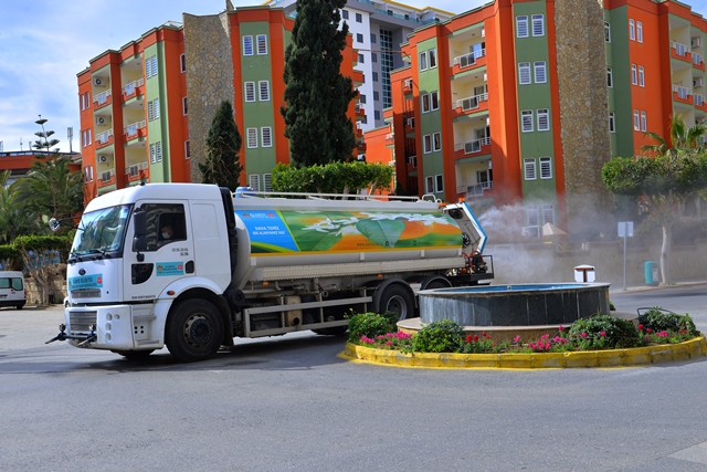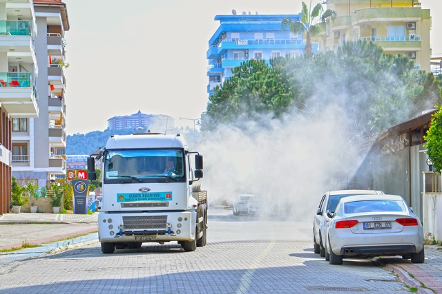 Alanya Belediyesi’nin COVID-19 ile mücadele kapsamında bünyesine kattığı Mikronsis aracı, hafta sonu kısıtlamasında da Alanya sokaklarında dezenfeksiyon hizmeti vermeye devam ediyor.