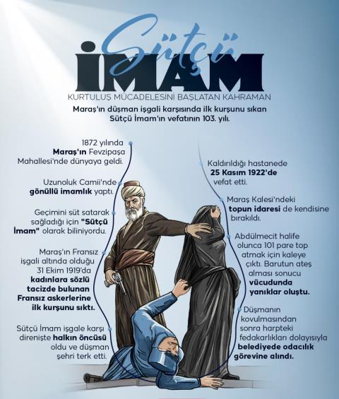 Kahramanmaraş'ta milli mücadelenin kahramanları arasında yer alan ve ilk kurşunu atarak Kahramanmaraş'ın işgalci düşmanlarına karşı direnişinin fitilini ateşleyen Sütçü İmam'ın kahramanca direnişinin 103. yılında gönüllerde yaşamaya devam ederken, bu kahramanlık öyküsü ise nesilden nesile aktarılmaya devam ediyor.