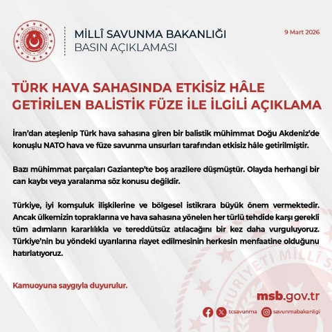 Açıklamada, İran'dan ateşlenip Türk hava sahasına giren bir balistik mühimmatın, Doğu Akdeniz'de konuşlu NATO hava ve füze savunma unsurları tarafından etkisiz hale getirildiği belirtilerek, şunlar kaydedildi: