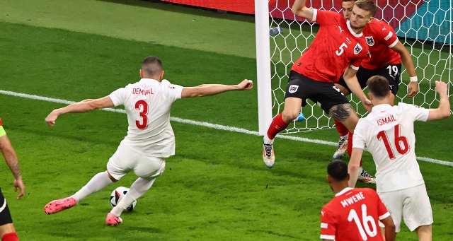 6. dakikada Avusturya’da Schimid’in soldan kullandığı köşe vuruşunda ön direğe yerden gelen ortayı Posch ayağıyla geriye aşırdı. Kale çizgisine paralel gelen meşin yuvarlağa arka direkte rakibinden önce müdahale eden Merih Demiral, topu kornere gönderdi.
