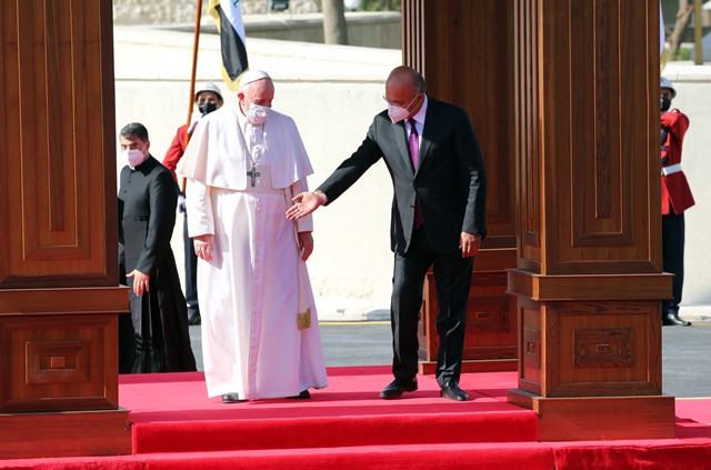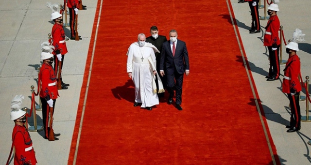 Korona virüs salgınında ilk kez İtalya dışına çıkan Katoliklerin ruhani lideri Papa Francis, Irak'a tarihi ziyaret gerçekleştiriyor. Papa Francis, Uluslararası Bağdat Havalimanı'nda Irak Başbakanı Mustafa el-Kazımi ve diğer yetkililer tarafından karşılandı. Papa, daha sonra Cumhurbaşkanlığı Sarayı'na geldi. Papa Francis, Cumhurbaşkanlığı Sarayı'nda Irak Cumhurbaşkanı Berhem Salih tarafından resmi törenle karşılandı. Papa ve Salih, resmi törenin ardından ikili görüşmeye geçti.