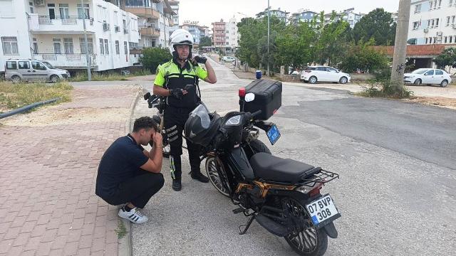 Manavgat’ın Emek Mahallesi’nde denetim yapan Manavgat Emniyet Müdürlüğü Trafik Denetleme Büro Amirliği ekipleri plakasız bir motosiklete işlem yaptıkları sırada yanlarından akrobatik hareketler yaparak geçen 07 BVP 308 plakalı motosiklet sürücüsünü durdurdu. Polis ekibi tarafından yapılan kontrolde 07 BVP 308 plakalı motosikleti kullanan Ebubekir K.'nın sürücü belgesinin olmadığı belirlendi. Motosiklet sürücüsü genç trafik ekiplerine "Abi lütfen yazma, denemiştim sadece" diyerek cezadan kurtulmaya çalıştı. Trafik ekipleri motosiklet sürücüsüne akrobatik hareket yapmaktan 2 bin 167 TL, sürücü belgesiz motosiklet kullanmaktan 18 bin 678 TL olmak üzere toplam 20 bin 845 TL para cezası uyguladı. – İHA