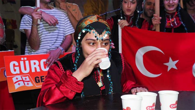 Tulum, gayda ve keman eşliğindeki yöresel kıyafetli ekiplerin dans gösterileri büyük ilgi topladı. 1 dakikada en fazla çay içenin kazanacağı yarışmada ise adaylar ülkelerinin bayrakları önünde yarıştı.