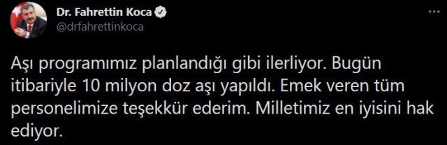 Sağlık Bakanı Fahrettin Koca, resmi sosyal medya hesabı üzerinden Covid-19 Aşısı Bilgilendirme Platformundan fotoğraf paylaşarak Türkiye'de 10 milyon kişinin aşılandığını bildirdi. Bakan Koca paylaşımda, “Aşı programımız planlandığı gibi ilerliyor. Bugün itibariyle 10 milyon doz aşı yapıldı. Emek veren tüm personelimize teşekkür ederim. Milletimiz en iyisini hak ediyor” ifadelerini kullandı.