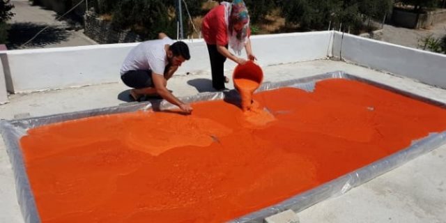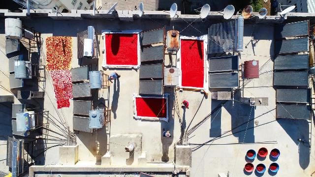 Biberlerini çektiren vatandaşlar son olarak ise suyunu çekmesi için damlara seriyor. Kent genelinde bazı apartmanların ve müstakil evlerim damlarına serilen çekilmiş salçalık biberler, damları kırmızıya boyarken havadan ilgi çekici görüntüler de oluştu.