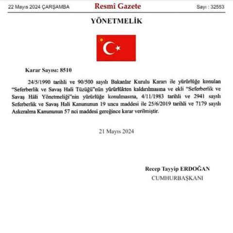 Cumhurbaşkanı Recep Tayyip Erdoğan'ın imzasıyla Resmi Gazete'de yayımlanan karar, Türkiye'nin savaş ve seferberlik durumlarında uygulanacak yasal düzenlemede değişikliğe gidildi.