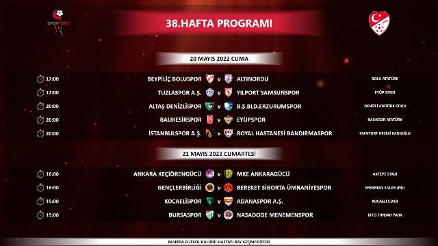 Spor Toto 1. Lig’in 2021-2022 sezonu 38. hafta programı açıklandı.