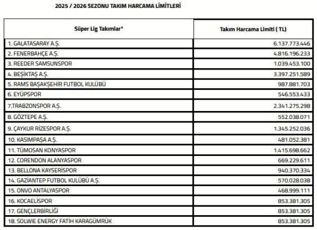 Türkiye Futbol Federasyonu Kulüp Lisans Kurulu, 30 Haziran 2025 tarihli toplantısında 2025-2026 sezonu Süper Lig Takım Harcama Limitleri’ni belirledi. 2024-2025 sezonunu şampiyonlukla tamamlayan Galatasaray’ın yeni sezondaki harcama limiti 6 milyar 137 milyon 773 bin 446 TL olarak belirlendi. Kurul tarafından Fenerbahçe’ye 4 milyar 816 milyon 196 bin 233 TL, Beşiktaş’a 3 milyar 397 milyon 251 bin 589 TL harcama limiti verildi.