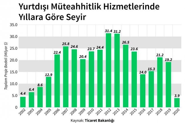 2019’da dünya genelinde 19,2 milyar dolarlık iş üstlenen Türk müteahhitler, 2020’nin 8 ayında pandeminin de etkisiyle 3,9 milyar dolarda kaldı.