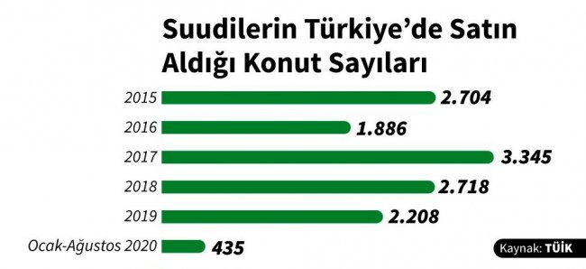Türkiye İstatistik Kurumu (TÜİK) verilerine göre, Türkiye'de son beş yılda yabancılara toplam 170 bin 938 adet konut satıldı. Bu konutların 13 bin 296’sını Suudiler aldı ve bu alanda Irak’tan sonra ikinci sırada yer aldılar.