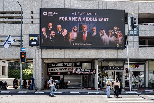 İran'la ateşkesin ardından İsrail'in Tel Aviv kentinde, Arap liderlerle normalleşme mesajı içeren dikkat çekici bir afiş asıldı.