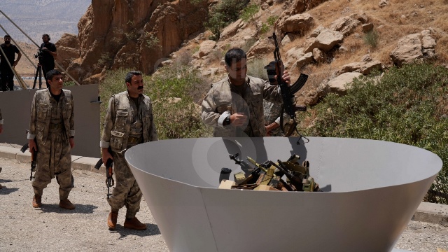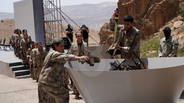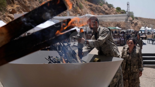 Terör örgütü PKK'nın aldığı fesih kararı sonrası ilk grubun silah bırakma işlemi tamamlandı. "Terörsüz Türkiye" sürecinin en kritik aşamalarından biri bugün gerçekleşti. Irak kuzeyindeki Suleymaniye kentinde bir grup PKK'lı silah bıraktı. Paylaşılan silah bırakma görüntülerinde silahların yakıldığı görüldü.