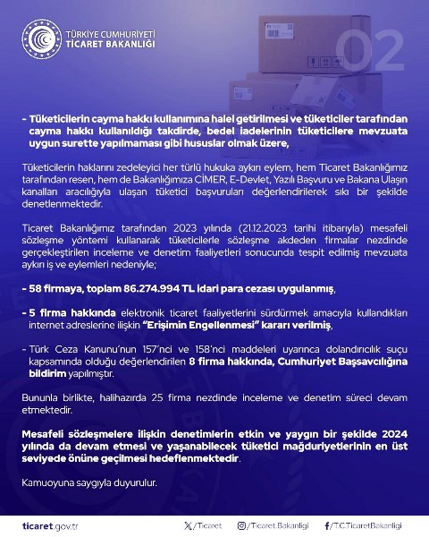 "Dolandırıcılık suçu kapsamında olduğu değerlendirilen 8 firma hakkında, cumhuriyet başsavcılığına bildirim yapıldı. Öte yandan, halihazırda 25 firmanın inceleme ve denetim süreci devam ediyor. Mesafeli sözleşmelere ilişkin denetimlerin etkin ve yaygın şekilde 2024 yılında da devam etmesi ve yaşanabilecek tüketici mağduriyetlerinin en üst seviyede önüne geçilmesi hedefleniyor."