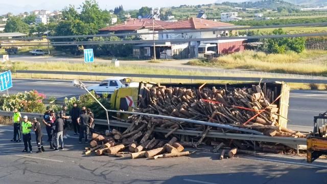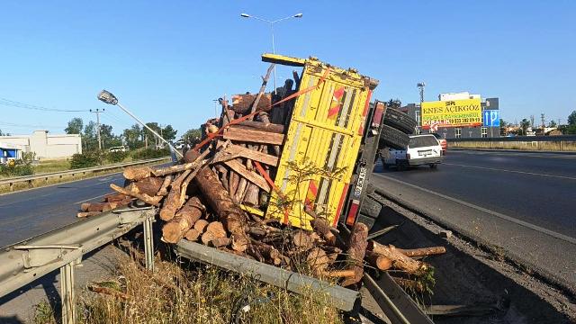 Manavgat’ta tomruk yüklü kamyonun bariyerleri aşıp refüje devrilmesi sonucu meydana gelen kazada şans eseri yaralanan olmadı.