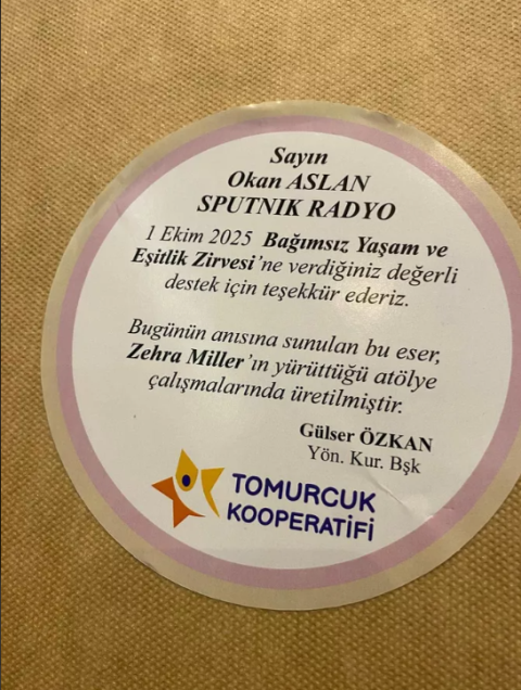 “Sayın Okan Aslan, Sputnik Radyo. 1 Ekim 2025 Bağımsız Yaşam ve Eşitlik Zirvesi’ne verdiğiniz değerli destek için teşekkür ederiz. Bugünün anısına sunulan bu eser, Zehra Miller’ın yürüttüğü atölye çalışmalarında üretilmiştir.”