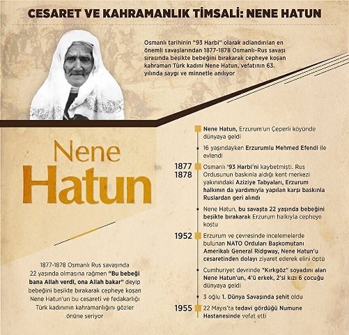 8 Kasım 1877 tarihinde Rusların, Erzurum’u ele geçirme tehlikesiyle birlikte halk ayaklandı. Bu sırada 22 yaşında gencecik bir anne olan Nene Hatun, bebeğini evde bırakarak Eruzurum halkı ile beraber cepheye koştu. Düşmanın vatan topraklarını işgal edebileceği düşüncesinden ötürü bir an bile tereddüt etmeyen Nene Hatun, kahramanca duruşu sebebiyle Türk kadınının cesaretini ve onurunu herkese göstermiş oldu. Kazmalar, kürekler, süngüler ile verilen savaşta Aziziye Tabyası halk tarafından en iyi şekilde savunuldu ve Ruslar Erzurum’dan uzaklaştrıldı. Yaptığı büyük fedakarlık sonrası Erzurum Eminkurbu Mahallesi’nde ikamet etmeye başlayan Nene Hatun’un sonrasında 4 erkek ve 2 kız çocuğu oldu. Bu sırada Osmanlı’da cerayan eden Balkan ve Birinci Dünya Savaşı’nda Nene Hatun, 2 oğlunu şehit verdi.