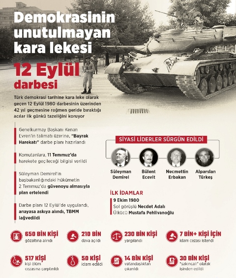 12 Eylül 1980 darbesi sürecinde, 650 bin kişi gözaltına alındı, açılan 210 bin davada 230 bin kişi yargılandı, 7 binden fazla kişi için idam cezası istendi. 517 kişinin ölüm cezasına çarptırıldığı süreçte, 50 kişi darağacına gönderildi.
