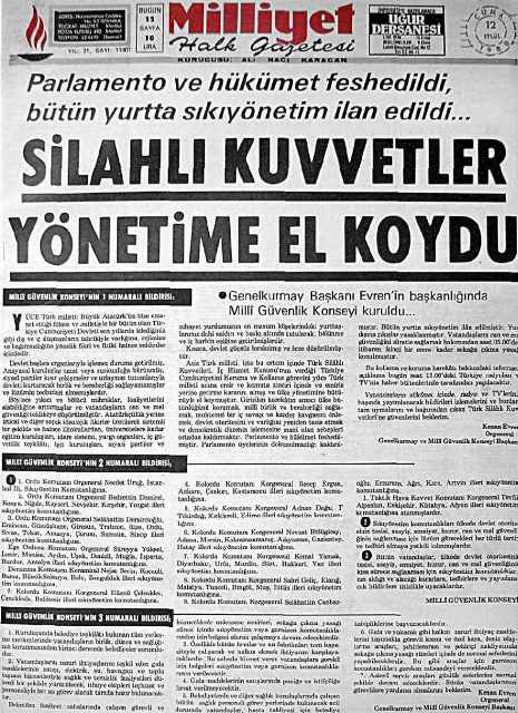 12 Eylül gecesi saat 03.00’te başlayan askeri darbe; önce iletişim kurumlarının ele geçirilmesiyle başlamış ve son olarak da İçişleri Bakanlığı, Emniyet Genel Müdürlüğü ve Başbakanlık konutunun kontrol edilmesiyle, saat 4 sularında tüm turda duyurulmuştur.
