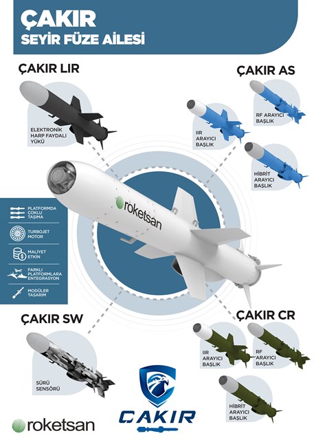 Roketsan'ın kara, deniz ve hava platformlarından atılabilen Seyir Füzesi ÇAKIR, son teknoloji özellikleri ve etkili harp başlığı ile silahlı kuvvetler için yeni bir güç çarpanı olacak. Roketsan geliştirdiği yeni teknolojiler ile harp sahasında yeni konseptler oluşturmaya devam ediyor. Sabit ve döner kanatlı hava araçları, TİHA/SİHA, SİDA, taktik tekerlekli kara araçları ve su üstü platformlardan atılabilen yeni Seyir Füzesi ÇAKIR; kara ve deniz hedeflerine karşı kullanıcıya operasyonel olarak geniş alternatifler sunuyor. 150 kilometrenin üzerinde menzili bulunan ÇAKIR'ın hedefleri arasında su üstü hedefler, kıyıya yakın kara ve su üstü hedefleri, stratejik kara hedefleri, alan hedefleri ve mağaralar bulunuyor. Kale Arge tarafından geliştirilen yerli ve milli KTJ-1750 turbo-jet motora sahip ÇAKIR, tasarımının getirdiği çeviklik sayesinde; görev planlama esnasında tanımlanan üç boyutlu dönüş noktalarını içeren görevleri kolaylıkla icra edebiliyor.