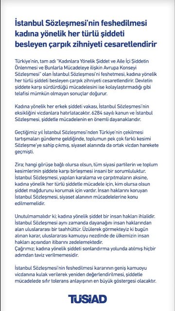 TÜSİAD, açıklamasında "İstanbul Sözleşmesi’nin feshedilmesi kadına yönelik her türlü şiddeti besleyen çarpık zihniyeti cesaretlendirir. Çağrımız; kadına yönelik şiddeti sonlandırma yolunda atılmış hiçbir adımdan taviz verilmemesidir." denildi.