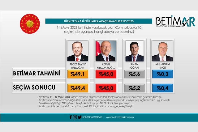 Anketçilerin arasında seçim tahminlerinde sonuca en çok yaklaşan firma Betimar oldu. 2018 seçimlerinde de benzer bir yakınlığa ulaşan Betimar Araştırma, 81 ilden örnekleme alma yönetimiyle gerçekleştirdiği tahminlerde Recep Tayyip Erdoğan yüzde 49,1, Kemal Kılıçdaroğlu yüzde 45, Sinan Oğan yüzde 5,6 ve Muharrem İnce yüzde 0,3 olarak öngördü.