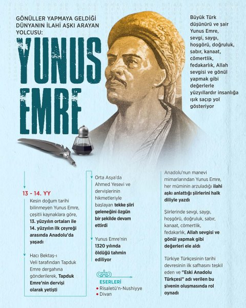 Büyük Türk düşünürü ve şair Yunus Emre, sevgi, saygı, hoşgörü, doğruluk, sabır, kanaat, cömertlik, fedakarlık, Allah sevgisi ve gönül yapmak gibi değerlerle yüzyıllardır insanlığa ışık saçıp yol gösteriyor.