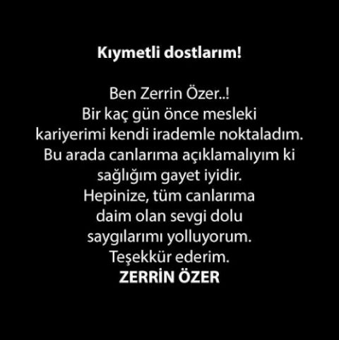 Zerrin Özer paylaşımında, "Kıymetli dostlarım! Ben Zerrin Özer..! Birkaç gün önce mesleki kariyerimi kendi irademle noktaladım. Bu arada canlarıma açıklamalıyım ki sağlığım gayet iyidir. Hepinize, tüm canlarıma saygılarımı yolluyorum. Teşekkür ederim. Zerrin Özer." ifadelerini kullandı.